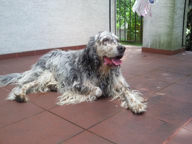 Seter, suka, duża, nakrapiana (siwo-czarno-troszkę brązowa).