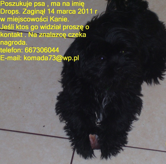 pies zaginął w miejscowości Kanie. Prawdopodobnie mógł go ktoś ukraść. Pies zaginął 14 marca 2011 roku . Gdyby ktoś go widział, niech się ze mną skontaktuje. Jeśli został ukradziony może go ktoś mieć. Dla znalazcy czeka nagroda .Pies jest kolory czarnego, waży ok. 5kg.